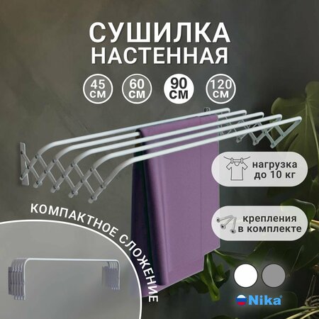 Вам нужна идеальная сушилка для белья? Тогда мы рады представить Вам уникальную настенную сушилку Ника, удобную для любого помещения и квартиры! У сушилки широкие и прочные прутья 1 см, которые не прогибаются под нагрузкой и предотвращают образование заломов на белье. Вы также можете наслаждаться ускоренным процессом высушивания, благодаря более интенсивной вентиляции воздуха между тканями. У сушилки складная конструкция. Она очень компактно хранится. Например, ее можно легко установить под подоконник, на балкон, на даче, в ванной, в предбаннике. Она может служить также как вешалка или подставка для полотенец. Теперь ваша стирка станет в радость. Это отличная сушилка для белья горизонтальная. Сушилка для одежды - вещь незаменимая в каждом доме! Благодаря стойкости к ржавчине, она отлично вам прослужит как сушилка для белья уличная. Многие покупатели устанавливают ее с внешней стороны дома. Можете также называть ее вешалка для сушки белья. Но неизменный факт: теперь у вас есть все средства для стирки! Сушилка имеет простой механизм складывания. Она также обладает антикоррозийным покрытием и пластмассовыми наконечниками на концах труб. Сушилка подходит для использования в любых помещениях и на открытом воздухе. Складная сушилка для белья Nika - это замечательная покупка, необходимая каждой хозяйке. Длина сушильного полотна составляет 45 см, 60 см, 90 см, 120 см. Поэтому подойдет для любого пространства. А максимальная нагрузка - 10 кг. Использование сушилки – это простой и экологически чистый способ сушки белья, который позволяет Вам сэкономить время и деньги. Сушилка очень легкая раскладная. Наслаждайтесь удобством и практичностью нашей сушилки и позвольте себе больше времени с Вашими близкими! Не гладьте ваши футболки! Сушилка для белья может стать отличным подарком для ваших близких. Крепеж в комплекте. НЕ обращайте внимание на цвета. ОНИ указаны для фильтра В озоне И для отображения всех размеров сушилки В одной карточке. Сушилка данной модели только белого И серого цвета.