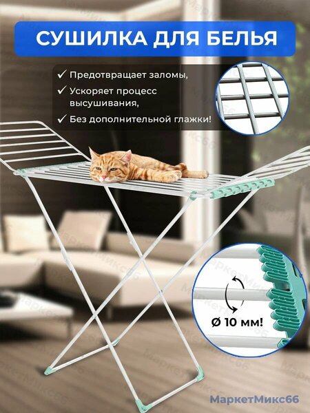 Мобильные компактные сушилки для белья - современная замена бельевым веревкам в ванной и на балконе. Складная сушилка подойдет для сушки как мелкого белья, одежды, детских вещей, так и для тяжелого белья, одеяла, покрывала. В сложенном виде занимает минимум места. Напольная система сушки белья имеет антикоррозийное покрытие. Удобная складная сушилка с полкой. Преимущества: устойчивая, складная сушилка; удобная полка; продольное и поперечное расположение сушильных прутьев на распашных створках; стальные струны с антикоррозийным покрытием; пластмассовые наконечники на опорах; подходит для использования в любых помещениях и на открытом воздухе; сушилка компактна в сложенном состоянии и вместительна в развернутом. Складная напольная сушилка для белья с распашными створками, при использовании которой на белье не образуются заломы Преимущества: