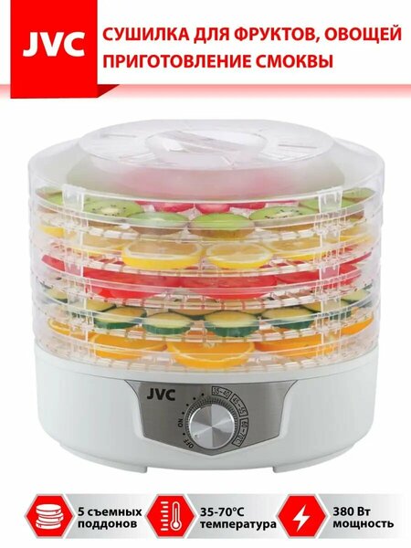 Сушилка для овощей, фруктов и мяса JVC JK-FD753 с регулировкой температуры от 35 до 70 градусов, 5 прозрачных поддонов, 380 Вт