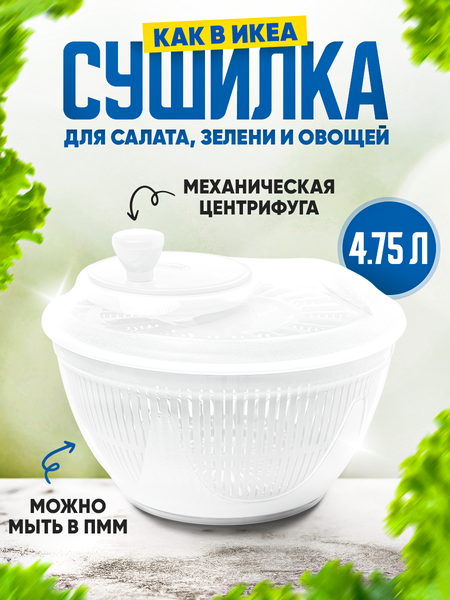 Сушилка для зелени, центрифуга для сушки салата, зелени и овощей, ручная, объем 4,75 л, цвет белый