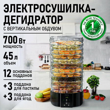 Сушилка для овощей и фруктов, 700 Вт, 18 поддонов: 12 поддонов, 3 поддона для ягод, 3 для пастилы, электронный контроль температуры от 40 до 70°C, установка времени до 48 часов, LED дисплей, встроенный вентилятор, световой индикатор работы, бесшумная работа. Корпус и поддоны из термостойкого пищевого пластика. Двенадцатиуровневая сушилка для фруктов c электронным контролем температуры для равномерной сушки трав, ягод, зелени, овощей, фруктов, орехов, грибов, приготовления вяленого мяса, птицы, рыбы, кисломолочных продуктов, а также расстойки теста. Поддоны сушилки изготовлены из пищевого термостойкого пластика. Сушка для овощей также укомплектована 3 поддонами для сушки ягод и 3 поддонами для приготовления пастилы. Это самый эффективный способ сохранения продуктов, для каждого из которых можно подобрать оптимальный температурный режим от 40 до 70°C и проконтролировать время работы на контрастном LED-дисплее. Электронный контроль температуры гарантирует соблюдение условий сушки без Вашего участия, а электронный таймер позволит установить время сушки до 48 часов. Встроенный вентилятор равномерно нагнетает воздух в пространство сушилки, обеспечивая необходимые условия для эффективного сохранения полезных микроэлементов. Бесшумная работа электросушилки не нарушит домашнего комфорта, а энергосберегающий режим позволит при этом сэкономить электроэнергию. Дегидраторв – необычайно полезный прибор, поскольку способен на долгое время сохранить питательную ценность многих сезонных продуктов, обеспечив здоровое питание на весь год. Девайсы для кухни - сушка для овощей - необычайно полезный прибор, для вкусного и здорового питания. Сушилка для грибов для дачи, сушка для фруктов удобный гаджет для приготовления вкусной и здоровой пищи, для похудения. Техника для кухни бытовая техника! Приготовление блюд с использованием кухонная техника сделает ваши рецепты вкусными и полезными!