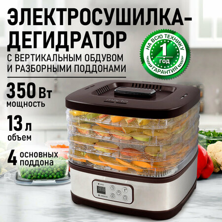 "350 W, 4 регулируемых по высоте съемных поддона, электронный контроль температуры от 35 до 70 С, таймер до 72 часов, LED дисплей, встроенный вентилятор, cветовые индикаторы. Подходит для сушки овощей, фруктов, трав. Сушилка для овощей и фруктов MARTA 4 разборных поддона для сушки 24x26 см, объем 13л, макс мощность 350 вт, LED-дисплеей, электронный контроль температуры от 35 до 70C, электронный таймер до 72 часов. Электросушилка c электронным контролем температуры для равномерной сушки трав, зелени, овощей, фруктов, орехов, грибов, приготовления вяленого мяса, птицы, рыбы, а так же возможностью приготовления пастилы, кисломолочных продуктов и расстойки теста. Корпус и поддоны сушилки изготовлены из пищевого термостойкого пластика, устойчивого к высоким температурам, не выделяющего вредных веществ и посторонних запахов, сохраняющего вкус и аромат продуктов натуральными. Это самый эффективный способ сохранения продуктов, для каждого из которых можно подобрать оптимальный температурный режим от 35 до 70°C и проконтролировать время работы на контрастном LED-дисплее. Цифровое управление позволяет работать с электросушилкой с комфортом и удовольствием. Электронный контроль температуры. Электронный таймер позволит установить время сушки до 72 часов, по истечении которых сушилка выключится автоматически. Встроенный вентилятор равномерно нагнетает воздух в пространство сушилки. Электросушилка – необычайно полезный прибор, поскольку способен на долгое время сохранить питательную ценность многих сезонных продуктов, обеспечив здоровое питание на весь год. Девайсы для кухни – Сушилка для овощей – необычайно полезный прибор, для вкусного и здорового питания. Сушилка для грибов для дачи, сушка для фруктов удобный гаджет для приготовления вкусной и здоровой пищи, для похудения. Техника для кухни бытовая техника отличный подарок на новый год маме или 8 марта бабушке! Сушилка, дегидратор для мяса и птицы, сушилка для грибов