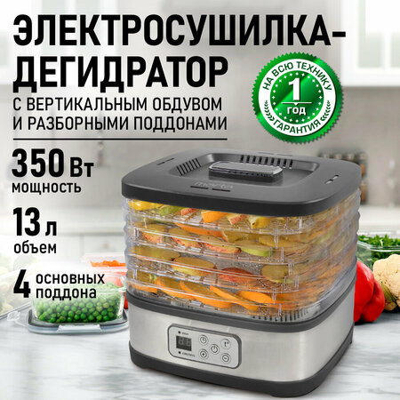 "350 W, 4 регулируемых по высоте съемных поддона, электронный контроль температуры от 35 до 70 С, таймер до 72 часов, LED дисплей, встроенный вентилятор, cветовые индикаторы. Подходит для сушки овощей, фруктов, трав. Сушилка для овощей и фруктов MARTA 4 разборных поддона для сушки 24x26 см, объем 13л, макс мощность 350 вт, LED-дисплеей, электронный контроль температуры от 35 до 70C, электронный таймер до 72 часов. Электросушилка c электронным контролем температуры для равномерной сушки трав, зелени, овощей, фруктов, орехов, грибов, приготовления вяленого мяса, птицы, рыбы, а так же возможностью приготовления пастилы, кисломолочных продуктов и расстойки теста. Корпус и поддоны сушилки изготовлены из пищевого термостойкого пластика, устойчивого к высоким температурам, не выделяющего вредных веществ и посторонних запахов, сохраняющего вкус и аромат продуктов натуральными. Это самый эффективный способ сохранения продуктов, для каждого из которых можно подобрать оптимальный температурный режим от 35 до 70°C и проконтролировать время работы на контрастном LED-дисплее. Цифровое управление позволяет работать с электросушилкой с комфортом и удовольствием. Электронный контроль температуры. Электронный таймер позволит установить время сушки до 72 часов, по истечении которых сушилка выключится автоматически. Встроенный вентилятор равномерно нагнетает воздух в пространство сушилки. Электросушилка – необычайно полезный прибор, поскольку способен на долгое время сохранить питательную ценность многих сезонных продуктов, обеспечив здоровое питание на весь год. Девайсы для кухни – Сушилка для овощей – необычайно полезный прибор, для вкусного и здорового питания. Сушилка для грибов для дачи, сушка для фруктов удобный гаджет для приготовления вкусной и здоровой пищи, для похудения. Техника для кухни бытовая техника отличный подарок на новый год маме или 8 марта бабушке! Сушилка, дегидратор для мяса и птицы, сушилка для грибов