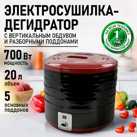 Электросушилка 5 разборных поддонов 20 л. Пятиуровневая электросушилка для равномерной сушки трав и зелени, овощей и фруктов, орехов и грибов, приготовления вяленого мяса птицы и рыбы, а так же возможностью приготовления кисломолочных продуктов и расстойки теста. Корпус и поддоны сушилки изготовлены из пищевого термостойкого пластика. Многоярусная конструкция электросушилки позволяет разместить в небольшом объеме максимум продуктов и добиться их наилучшего распределения для быстрого и равномерного высушивания. Для каждого продукта можно подобрать оптимальный температурный режим от 35 до 70C с помощью удобного регулятора. Встроенный вентилятор. Бесшумная работа. Энергосберегающий режим. Электросушилка - необычайно полезный прибор, поскольку способен на долгое время сохранить питательную ценность многих сезонных продуктов, обеспечив здоровое питание на весь год. Для приготовления пастилы необходимо вырезать подложку из пергамента (бумаги для выпечки) по размеру секции, смазать маслом и распределить массу для пастилы на поверхности бумаги. Девайсы для кухни – Сушилка для овощей – необычайно полезный прибор, для вкусного и здорового питания. Сушилка для грибов для дачи, сушка для фруктов удобный гаджет для приготовления вкусной и здоровой пищи, для похудения. Техника для кухни бытовая техника отличный подарок на новый год маме или 8 марта бабушке! Приготовление блюд с использованием кухонная техника Марта сделает ваши рецепты вкусными и полезными!