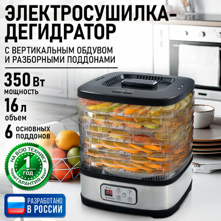 "350 W, 6 регулируемых по высоте съемных поддона, электронный контроль температуры от 35 до 70 С, таймер до 72 часов, LED дисплей, встроенный вентилятор, cветовые индикаторы. Подходит для сушки овощей, фруктов, трав. Сушилка для овощей и фруктов MARTA 6 разборных поддона для сушки 24x26 см, объем 16л, макс мощность 350 вт, LED-дисплеей, электронный контроль температуры от 35 до 70C, электронный таймер до 72 часов. Электросушилка c электронным контролем температуры для равномерной сушки трав, зелени, овощей, фруктов, орехов, грибов, приготовления вяленого мяса, птицы, рыбы, а так же возможностью приготовления пастилы, кисломолочных продуктов и расстойки теста. Корпус и поддоны сушилки изготовлены из пищевого термостойкого пластика, устойчивого к высоким температурам, не выделяющего вредных веществ и посторонних запахов, сохраняющего вкус и аромат продуктов натуральными. Это самый эффективный способ сохранения продуктов, для каждого из которых можно подобрать оптимальный температурный режим от 35 до 70°C и проконтролировать время работы на контрастном LED-дисплее. Цифровое управление позволяет работать с электросушилкой с комфортом и удовольствием. Электронный контроль температуры. Электронный таймер позволит установить время сушки до 72 часов, по истечении которых сушилка выключится автоматически. Встроенный вентилятор равномерно нагнетает воздух в пространство сушилки. Электросушилка – необычайно полезный прибор, поскольку способен на долгое время сохранить питательную ценность многих сезонных продуктов, обеспечив здоровое питание на весь год. Девайсы для кухни – Сушилка для овощей – необычайно полезный прибор, для вкусного и здорового питания. Сушилка для грибов для дачи, сушка для фруктов удобный гаджет для приготовления вкусной и здоровой пищи, для похудения. Техника для кухни бытовая техника отличный подарок на новый год маме или 8 марта бабушке! Сушилка, дегидратор для мяса и птицы, сушилка для грибов