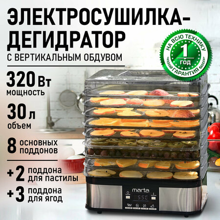 Сушилка для овощей и фруктов, 320 Вт, 13 поддонов: 8 поддонов для сушки (размер 1 поддона 33*25,5см), 3 для ягод, 2 для пастилы, объем 30 л, электронный контроль температуры от 40 до 70°C, установка времени до 48 часов, LED дисплей, встроенный вентилятор, световой индикатор работы, бесшумная работа. Корпус из нержавеющей стали, поддоны из термостойкого пластика. Восьмиуровневая сушилка для фруктов c электронным контролем температуры для равномерной сушки трав, ягод, зелени, овощей, фруктов, орехов, грибов, приготовления вяленого мяса, птицы, рыбы, кисломолочных продуктов, а также расстойки теста. Сушка для овощей также укомплектована 3 поддонами для сушки ягод и 2 поддонами для пастилы. Это самый эффективный способ сохранения продуктов, для каждого из которых можно подобрать оптимальный температурный режим от 40 до 70°C и проконтролировать время работы на контрастном LED-дисплее. Электронный контроль температуры гарантирует соблюдение условий сушки без Вашего участия, а электронный таймер позволит установить время сушки до 48 часов, по истечении которых сушилка выключится автоматически, полностью избавив от необходимости следить за ее работой. Встроенный вентилятор равномерно нагнетает воздух в пространство сушилки, обеспечивая необходимые условия для эффективного сохранения полезных микроэлементов. Бесшумная работа электросушилки не нарушит домашнего комфорта, а энергосберегающий режим позволит при этом сэкономить электроэнергию. Дегидратор – необычайно полезный прибор, поскольку способен на долгое время сохранить питательную ценность многих сезонных продуктов, обеспечив здоровое питание на весь год. Девайсы для кухни – Сушилка для овощей – необычайно полезный прибор, для вкусного и здорового питания. Сушилка для грибов для дачи, сушка для фруктов удобный гаджет для приготовления вкусной и здоровой пищи, для похудения. Техника для кухни бытовая техника. Приготовление блюд с использованием кухонная техника сделает ваши рецепты вкусными и полезными!