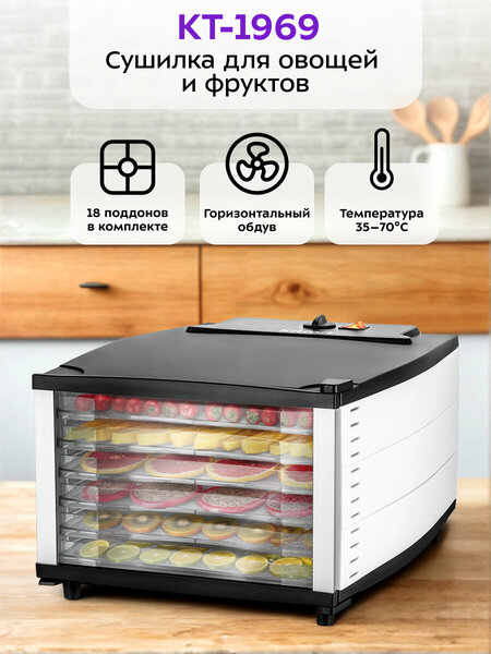 Электрическая сушилка Kitfort КТ-1969 сохранит любимые фрукты и овощи полезными круглый год! Она предназначена для сушки овощей, фруктов, ягод, грибов, корнеплодов, трав и зелени, а также хлеба. На панели есть регулятор, с помощью которого вы можете установить температуру от 35 до 70°C. Регулятор имеет плавное переключение температур. Сушилка непрерывно работает 35 часов, после этого необходимо сделать перерыв 2 часа перед следующим включением. Сушилка имеет в комплекте 6 пластиковых поддонов, 6 сеток и 6 сплошных поддонов. Пластиковые поддоны подходят для большинства типов продуктов. Сетки используются для небольших продуктов. Пластиковые сплошные поддоны служат для сушки водянистых продуктов. В сушилку установлен мощный нагревательный элемент и вентилятор, обеспечивающий равномерное распределение нагретого воздуха по всему объёму камеры. Благодаря горизонтальному обдуву смешение запахов при сушке одновременно разных продуктов минимально.