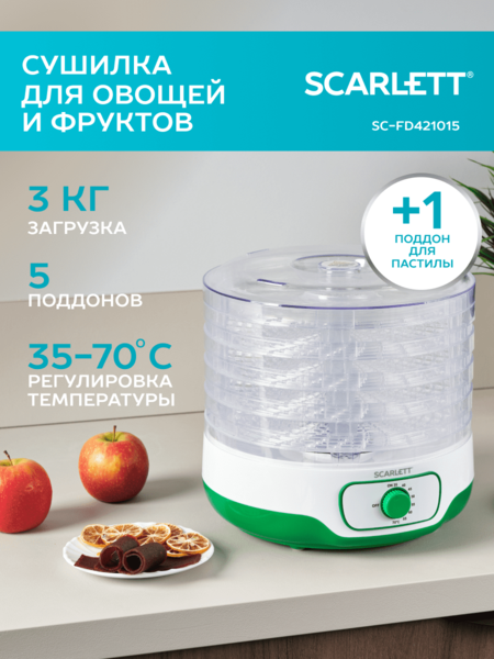 Необычная и многофункциональная сушилка SCARLETT SC-FD421015 – идеальный выбор для тех, кто заботится о здоровом питании и любит вкусные кулинарные эксперименты. Ее яркий оригинальный дизайн с корпусом бело-зелёного цвета позволит прибору вписаться в любой интерьер. Модель предназначена для сушки ягод, фруктов, зелени и овощей, приготовления фруктовой пастилы. Благодаря SC-FD421015 можно сохранить урожай и все его полезные свойства в домашних сухофруктах. При этом в SC-FD421015 можно приготовить сыровяленые блюда из рыбы, мяса и птицы. В сушилке SCARLETT SC-FD421015 - 5 вместительных прозрачных пластиковых поддона, а также поддон для пастилы из яблок и других фруктов.