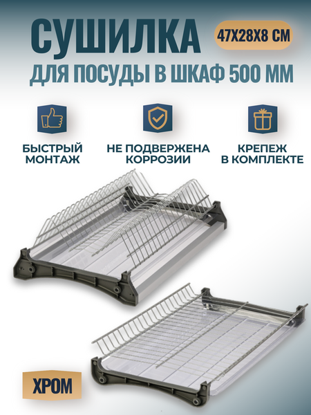 Сушилка для посуды с поддоном в шкаф 50 сантиметров- надежное решение для хранения вымытой посуды, тарелок и стаканов. Данный с рамкой подходит в кухонный гарнитур нижнюю и верхнюю базу 500мм. Ее конструкция создана таким образом, что позволяет устанавливать тарелки ребром, это способствует быстрому стеканию воды и высушиванию. Конструктивной особенностью это сушки является алюминиевая рамка, позволяющая изготовить шкафчик "без дна" таким образом внутри модуля достигается максимальная вентиляция. Наши посудосушители рассчитаны на стандартную плиту ДСП толщиной 16 мм. Посудосушитель в кухонный шкаф имеет размеры 468х280х75(35)мм, 2-х ярусный, встраиваемый и подходит для навесного шкафа, нижних и всех кухонных шкафов шириной 50 см. Часто используется как кухонная сушилка, двухуровневая сушка на кухню, посудосушитель в шкаф, посудосушка в шкаф над раковиной. Сушка устанавливается легко за 10 минут, прочная, не прогибается, проходит 3 этапа обработки металла и покраски в термической камере, не боится влаги. Допустимая нагрузка на уровень – 7кг. Цвет – хром Материал - Хромированная сталь Преимущества: - удобная в эксплуатации; - обладает компактными размерами и малым весом; - легко монтируется в кухонный шкаф длиной 50 см; - имеет поддон для сбора воды; - не боится влаги; - имеется дополнительный отсек для сушки чашек и стаканов. Компактное и аккуратное размещение вымытой посуды на сушилке добавит ощущение чистоты и уюта. Защитно-декоративное покрытие придает привлекательный вид, предотвращает появление коррозии. Решетчатая конструкция не дает застаиваться влаге. Покрыта устойчивой к стиранию полимерной краской.
