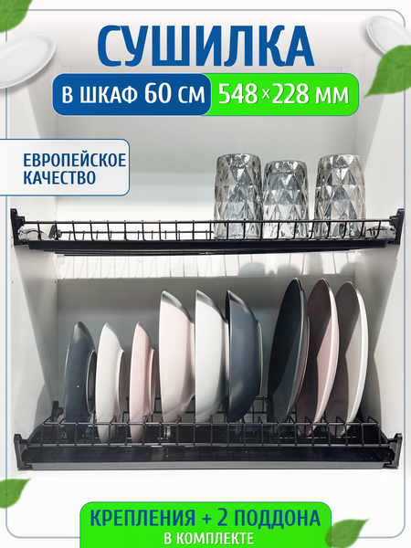 Навесная сушилка с поддоном на кухню - надежное решение для хранения вымытой посуды. В представленом наборе две подставки - ровная для стаканов, кружек и чашек и вместительная пока для тарелок. В комплект также входит два поддона-накопителя из толстого пластика для стекающей воды. Подвесная сушилка под посуду устанавливается на стену или в шкаф легко за 10 минут! Прочная решетка не прогибается. На производстве проходит 3 этапа обработки металла и покраски в термической камере, не боится влаги. Двухуровневая металлическая сушка из стали черного цвета с рамкой подходит в нижнюю и верхнюю базу над раковиной. Прочная настенная конструкция над мойкой позволяет устанавливать тарелки ребром для быстрого стекания воды. Посудосушитель подходит для всех кухонных шкафов шириной 60 см. Максимальная нагрузка на полки - 15 кг.