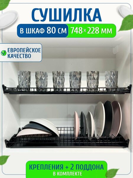 Навесная сушилка с поддоном на кухню - надежное решение для хранения вымытой посуды. В представленом наборе две подставки - ровная для стаканов, кружек и чашек и вместительная пока для тарелок. В комплект также входит два поддона-накопителя из толстого пластика для стекающей воды. Подвесная сушилка под посуду устанавливается на стену или в шкаф легко за 10 минут! Прочная решетка не прогибается. На производстве проходит 3 этапа обработки металла и покраски в термической камере, не боится влаги. Двухуровневая металлическая сушка из стали черного цвета с рамкой подходит в нижнюю и верхнюю базу над раковиной. Прочная настенная конструкция над мойкой позволяет устанавливать тарелки ребром для быстрого стекания воды. Посудосушитель подходит для всех кухонных шкафов шириной 80 см. Максимальная нагрузка на полки - 15 кг.