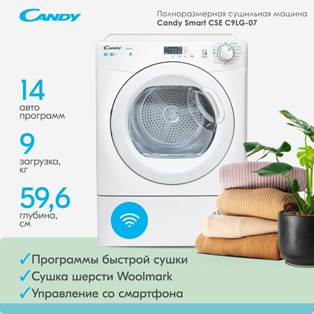Полноразмерная сушильная машина для белья Candy Smart CSE C9LG-07 сделает вашу жизнь проще, избавив от ежедневной рутины. Компания Канди запустила новую линейку максимально простых в использовании и функциональных сушильных машин, чтобы вы смогли больше времени тратить на себя и на то, что вам действительно нравится. Сушильная машина сделает все за вас, а результат будет просто потрясающим! В сушильных машинах Candy с новым удобным дизайном дверца расположена на 3.5 сантиметра выше - вам потребуется приложить минимум усилий для загрузки и разгрузки вещей. Машина для сушки белья позволит не беспокоиться за шерстяные вещи и деликатные ткани, благодаря сертифицированной программе сушки шерстяных изделий Woolmark с особенным вращением барабана и умным контролем температуры, которая высушит вещи максимально аккуратно. С функцией отложенного запуска вы сможете начать сушку в любое удобное время в течение 24 часов. Кроме того, в сушильной машине для белья Канди продумана функция супер лёгкой глажки, в процессе которой специальный сенсор проанализирует конкретную ситуацию и поможет создать идеальную влажность внутри барабана, чтобы вы смогли погладить вашу одежду в два раза быстрее. Помимо этого, вы сможете подключить свой смартфон к сушильной машине через систему NFC. Благодаря применению системы автоопределения загрузки, вы можете спокойно сушить как небольшое количество белья (от 1 кг), так и использовать максимальную загрузку, экономя до 70% энергии и обеспечивая оптимальную защиту вашего белья. Лучший результат в компактной сушильной машине от Candy!