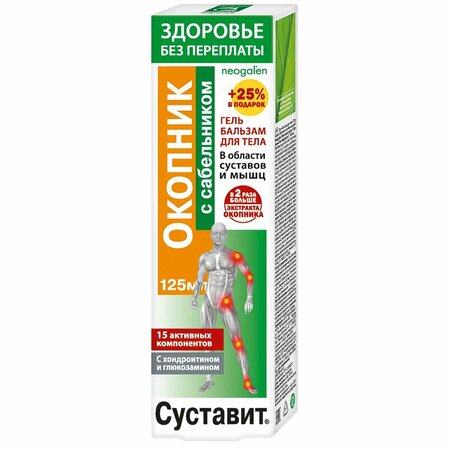 Суставит Окопник с сабельником" Neogalen (Неогален) серии "Здоровье без переплат" - эффективное средство на основе природных компонентов. Способствует нормализации функционального состояния. Обеспечивает структурными элементами для активного обновления и гибкости. Стимулирует естественную регенерацию тканей, препятствует развитию деструктивных процессов и старению. Действие и эффективность геля бальзама для тела обеспечены высокой биологической активностью его натуральных компонентов, обладающих выраженным положительным комплексным действием.