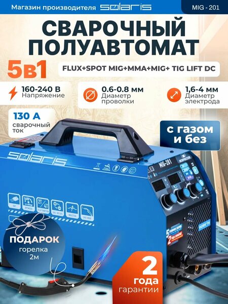 Сварочный аппарат полуавтомат Solaris MIG-201 – мощный, надежный и универсальный сварочный аппарат, идеально подходящий для использования в паяльно-термических работах. Этот сварочный аппарат полуавтомат Solaris MIG-201 оснащен встроенной горелкой длиной 2 м, что позволяет осуществлять сварку в удобном положении. Инструмент обладает 5 в 1 функциями: режим полуавтоматической сварки MIG/MAG/FLUX, режим сварки точками SPOT MIG, режим сварки без газа FLUX, режим ручной дуговой сварки MMA, режим аргонодуговой сварки постоянным током LIFT DC TIG (горелка приобретается отдельно), что дает возможность выполнять различные виды сварочных работ. Микропроцессорное управление и работа на 4 IGBT-транзисторах делают этот аппарат надежным решением для выполнения задач сварки. Этот сварочный полуавтомат обладает высокой продолжительностью включения до 60% при температуре 20°С и может использоваться с катушками весом до 5 кг и диаметром до 200 мм. Сварка полуавтомат оснащена кнопкой подачи заправки проволоки без подачи напряжения, что делает его безопасным для оператора. Возможность смены полярности для сварки проволокой без газа (FLUX) позволяет упростить работу, а стабильная работа в сетях с пониженным напряжением (от 160В) делает его универсальным решением для использования в различных условиях. Режим 2Т/4Т (для MIG) и режим сварки SPOT (сварка точками с длительностью от 0,3 до 30 секунд) позволяют выполнить различные сварочные работы. Сварка солярис MIG-201 имеет функцию регулировки индуктивности дуги, что позволяет изменять параметры глубины провара и формы валика сварочного шва, а регулировка интенсивности форсажа дуги (MMA) обеспечивает стабильную работу во время сварки. Этот сварочный аппарат поставляется в комплекте с горелкой сварочной 2 метра, электрододержателем с кабелем 2 метра, клеммой заземления с кабелем 1,5 метра, подающим роликом для проволоки 0,6-0,8 мм (установлен в механизм подачи проволоки). Сварка полуавтомат Solaris и набор инструментов для дома прекрасная альтернатива таким брендам как deko, деко, ресанта. Инструмент строительный Solaris MIG-201 может работать на напряжении питающей сети от 160 до 240 В и частотой 50 Гц. Оборудование работает на однофазной сети. Сварочный аппарат имеет номинальный выход в диапазоне от 30 до 130 А для метода MIG/MAG и от 10 до 120 А для методов MMA и TIG. Рабочий цикл при максимальном токе составляет 20% при 40°C и 60% при 20°C в соответствии с EN 60974-1. Рекомендуемая мощность генератора для работы оборудования составляет 5,1 кВА, а номинальная потребляемая мощность при максимальном токе - 2,3 кВт. Для работы с аппаратом подойдет проволока для сварки диаметром от 0,6 до 0,8 мм и электроды для сварки 3 мм, а также диаметром 1,6 до 4,0 мм. Для метода TIG можно использовать электроды диаметром от 0,5 до 2,4 мм. Оборудование имеет эффективность 0,80 и фактор мощности COS 0,7. Класс изоляции - H, а класс защиты - IP21S. Масса без принадлежностей составляет 9,3 кг, а габаритные размеры (ДxШxВ) - 430x210x335 мм. Гарантийный срок на сварочный аппарат составляет 24 месяца.