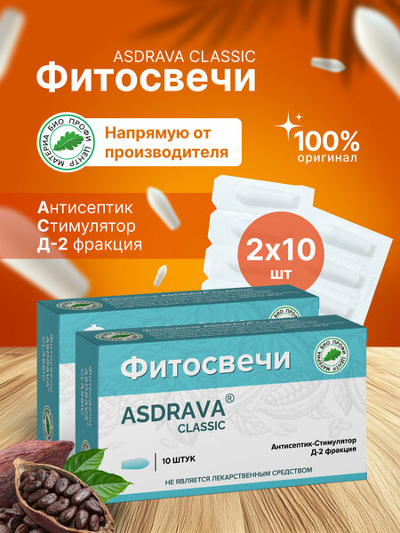 Не является лекарственным средством. Свечи ASDRAVA CLASSIC с Антисептиком-Стимулятором Д-2 фракцией (ранее выпускались как свечи с фракцией АСД-2 Дорогова) Состав: масло какао, Антисептик-Стимулятор Д-2 фракция. Форма выпуска: фитосвечи по 10 штук в упаковке. Срок годности: 24 месяца. Дата изготовления: смотреть на упаковке. Условия хранения: хранить в сухом защищённом от света недоступном для детей месте при температуре не выше 12⁰С. Противопоказания: индивидуальная непереносимость компонентов, беременность, период лактации. Показания к применению: онкологические заболевания, гипертоническая болезнь, бронхиальная астма, кожные заболевания, туберкулёз, заболевания желудочно-кишечного тракта и мочеполовой системы, гнойные септические заболевания, а также их профилактика. Способ применения: ректально или вагинально ‒ по 1 свече 1-2 раза в день 10-30 дней. В гинекологической практике (вагинально): кольпиты, трихомониаз, половой герпес, миома матки, молочница ‒ по 1 свече утром и вечером 10 дней; эрозия шейки матки ‒ по 1 свече утром и вечером 20 дней; фибромиома матки ‒ по 1 свече утром и вечером 30 дней. При заболеваниях мочеполовой системы (ректально): простатит, доброкачественная гиперплазия предстательной железы ‒ по 1 свече утром и вечером в течение 30 дней. При геморрое (ректально) ‒ по 1 свече утром и вечером 10 дней, затем по 1 свече на ночь 10 дней. При заболеваниях кожи (ректально): дерматит, экзема, трофические язвы, псориаз, витилиго ‒ по 1 свече утром и вечером 20 дней. При онкологических заболеваниях (ректально) ‒ по 1 свече утром и вечером 30 дней При необходимости курс приёма повторить через 15-30 дней. Не следует превышать рекомендуемую суточную дозу. Важно! Если состояние при приёме свечей ухудшается, следует прекратить их применение. В случае возникновения болезненных ощущений приём прекратить до утихания боли, после чего приём возобновить с начала схемы. При применении свечей следует исключить алкоголь; увеличить употребление воды до 2,5-3 литров в день. Антисептик-Стимулятор Д-2 фракция – водорастворимая фракция сухой перегонки тканей животного происхождения, относится к группе биогенных стимуляторов, является уникальным комплексом низкомолекулярных компонентов, который повышает обменные и тканевые процессы, способствует естественному восстановлению организма. Входящие в его состав азотистые и аммонийные соединения (аминокислоты, производные алифатических аминов, карбоновые кислоты, алифатические и циклические углеводороды) оказывают противовоспалительное, антиаллергическое, антимикробное, адаптогенное, антиоксидантное действие. Антисептик-Стимулятор Д-2 фракция имеет полностью натуральный состав, который активизирует деятельность пищеварительной, нервной, эндокринной, мочеполовой, сердечнососудистой и других систем организма, способствуя восстановлению их функций и значительному улучшению здоровья, независимо от пола и возраста. Масло какао ‒ продукт растительного происхождения, полученный из молотых зёрен плодов шоколадного дерева; используется в фармацевтической и косметической промышленности при производстве мазей, свечей и кремов. Масло какао содержит антиоксиданты (предотвращают прогорклость, обеспечивают продолжительный срок хранения), метилксантин и танины (оказывают тонизирующее и ранозаживляющее дейс