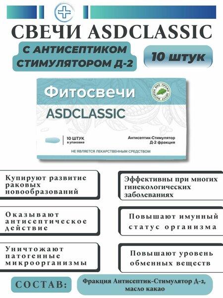 Фитосвечи ASD фракция-2 – это универсальное средство для женского здоровья и для мужского здоровья. Они предназначены для решения различных проблем со здоровьем, как для животных, так и для людей. Именно в составе этих свечей всего два компонента: Натуральное масло какао и АСД. В них не добавляется ни воск, ни парафин. Свечи используются ректально (анально), вагинально. Вагинальные свечи – это идеальное решение для борьбы с различными гинекологическими проблемами, включая эндометриоз, мастопатия, кандидоз, киста, миома матки, эрозию шейки матки и от молочницы по-женски. Свечи АСД-2 дорогова помогают при заболеваниях желудочно-кишечного тракта, улучшают пищеварение, что обеспечивает необходимую поддержку при расстройствах ЖКТ, поджелудочной железе, воспаление желчного пузыря, гастрите и дисбактериозе. Свечи АСД 2 фракция улучшают микрофлору кишечника и влагалища. Применение АСД при артрите, полиартрозе (артроз) и псориазе положительно отражается на здоровье человека, даже при тяжелых формах болезни. Ректальные свечи будут эффективными при заболеваниях мочеполовой системы, таких как цистит, простатит и аденома простаты, а их противовирусное и противогрибковое действие делает их универсальным средством для поддержки мужского и женского здоровья. АСД 2 фракцию назначают для вспомогательной терапии пиелонефрита и в качестве профилактического средства при хронических заболевания почек и печени. Суппозитарии ректальные и вагинальные имеют антисептический эффект. Свечи АСД помогут нормализовать репродуктивную функцию, усилить потенцию. Гинекологические фитосвечи направлены на укрепление стенок сосудов и улучшение кровообращения, что полезно при варикозе, тромбофлебите, геморрое и трещинах, трофических язвах. При венерических инфекциях таких как хламидиоз, герпес генитальный помогут свечи асд фракция 2. Противоопухолевое действие оказывают компоненты этого лечебного фито-средства при полипе и также тормозят развитие злокачественных опухолей. Мазь с АСД обладает выраженным антисептическим действием. Свечи не являются лекарственным средством. Перед применением рекомендуется проконсультироваться со специалистом.