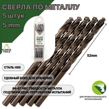Общая длина сверла - 86мм, рабочая длина - 52мм. Сверло российского брэнда ELBRUS TOOLS предназначено для сверления в металле. Марка и твердость металла подтверждены протоколом испытаний российской специализированной лаборатории (№МЭХТ-12012024-1 от 12.01.2024 г.). Сверло по металлу изготовлено из быстрорежущей высококачественной стали HSS. Твердость режущих кромок 64–67 HRС, что является отличным показателем износостойкости сверла! Внешняя поверхность обработана полированием, что обеспечивает большую точность размера. Кончик сверла имеет двойную заточку, это позволяет засверливаться без предварительного кернения. Поставляется в удобной пластиковой коробке для хранения. Вы получаете прекрасный набор сверл, который компактно поместится в любое пространство, где хранятся инструменты. Тип хвостовика - цилиндрический. Подходит для нержавеющей стали и для профессионального пользования. Сверло отличного качества! Качественные сверла Эльбрус можно также преподнести как подарок мужчине. Хороший мужской подарок оценят представители сильного пола! Сверла Эльбрус Тулз имеют высокое содержание кобальта в составе, кобальтовые сверла - это всегда прекрасное качество. Мы не вводим в заблуждение покупателей и не указываем несуществующих характеристик. Кобальтовое напыление, легирование и прочее – все это маркетинговые уловки. Твердость металла и состав наших сверл были изучены в экспертной лаборатории, документы об испытаниях можете найти в карточке!
