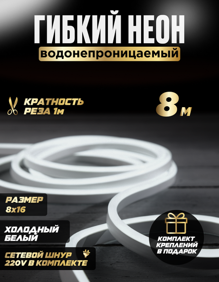 Гибкий неон – это безопасная и герметичная светодиодная лента в силиконе длиной 8 метров. LED подсветка имеет высокую плотность светодиодов – 120 шт. на каждый метр, благодаря чему во включенном виде выглядит как яркая равномерная линия света. Неоновая лента не нагревается даже при продолжительной работе и может выдерживать перепады температур от -40 до +50 градусов. ВАЖНО! Неоновую ленту НЕЛЬЗЯ ИСПОЛЬЗОВАТЬ в скрученном виде, создается индукция. Поэтому перед применением всегда разматывайте неон. Диодная лента полностью герметична, водонепроницаема, пыле и влагозащищённая. Уровень защиты IP67. Благодаря этим характеристикам спектр применения данной светодиодной подсветки очень обширен. Гибкий неон успешно используют для подсветки в комнате, на кухне, на фасадах зданий в качестве контурной подсветки, для бассейнов и ванных комнат, для изготовления рекламных вывесок, для создания арт-объектов и декора в помещении. Созданная на основе технологии светодиодного освещения, эта неоновая лента сочетает в себе высокое качество и долговечность. Срок службы светящейся ленты – 50.000 часов. Неоновая лента гибкая и позволяет создавать любые контуры. При необходимости ленту можно отрезать, кратность резки 1 метр. LED лента полностью готова к использованию и не требует переходников. Работает от розетки 220V. Так что, если вы ищете способ создать свое уникальное пространство, добавить индивидуальность и стиль в интерьер, создать уют, то гибкий неон – идеальный выбор для вас! Обратите внимание, что в нашем магазине представлены разнообразные варианты неоновых лент и светодиодных подсветок в силиконе, которые вы сможете подобрать под свои потребности.