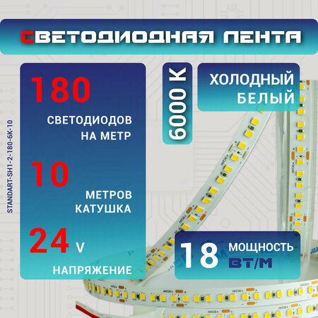 Светодиодная лента 180 светодиодов SMD 2835 на 1 метр, мощность 18 Вт./м, напряжение 24 вольт, норма упаковки - катушка 10 метров, защита IP 20, ширина подложки - 10 мм. Светодиодная лента холодного белого цвета (6000K) длиной 10 м станет прекрасным решением для освещения крупных помещений. Ее чистый, яркий свет создаст свежую, современную атмосферу на Вашем объекте. Плотность 180 диодов/м гарантирует равномерность освещения при низком энергопотреблении 18 Вт/м. Универсальное напряжение 24В и клейкая подложка обеспечивают простоту установки. Идеальна для освещения выставочных залов, производственных цехов, торговых центров, освещений кухонных зон.