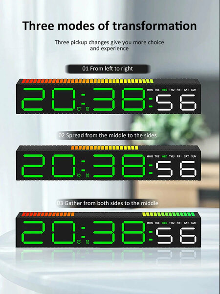 Особенности ⏰ Подсветка меняется в зависимости от громкости ⏰ Десять стилей на выбор ⏰ Три режима музыкального ритма ⏰ 12/24 часа ⏰ Автоматическая регулировка светочувствительности + три уровня ручной регулировки яркости Основные параметры Категория товара: Будильник Двусторонний: Односторонний Внешний вид: Прямоугольный Применимые места: кабинет, офис, общественные места и другие Тип дисплея: Цифровой Тип экрана дисплея: СВЕТОДИОДНЫЙ Водонепроницаемость: Не допускается Тип питания: внешний источник питания Материал: ABS Цвет изделия: черный Светлый цвет: зеленый + белый Пакет включает в себя: 1 шт. × часы 1 шт. × USB-кабель 1 шт. × руководство пользователя Примечание ※ Режим постоянного освещения: При питании от сети 5 В постоянного тока экран будет постоянно включен ※ Режим работы от батареи: Работает от 2 батареек типа ААА, только для резервного копирования, не отображается на экране
