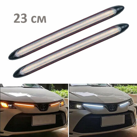 Яркие светодиодные дневные ходовые огни с бегущим сигналом поворота - современный элемент тюнинга автомобиля. При включении загораются белые дневные ходовые огни в бегущем режиме, затем останавливаются. При включении сигнала поворота загораются желтые бегущие огни. ДХО выполнены в гибком, полностью герметичном силиконовом корпусе. Подходят для любого автомобиля. Очень просто устанавливаются на крепкий 3М скотч или саморезы. Для саморезов предусмотрены специальные отверстия в корпусе. ДХО можно установить на бампер, в решетку радиатора, в нишу противотуманок, все зависит от вашей фантазии и конструкции авто. Светодиодные дневные ходовые огни сделают ваш автомобиль стильным и современным, позволят выделиться из серого потока. Кроме того другие участники движения будут лучше видеть ваше намерение повернуть или перестроиться. Характеристики: Тип: Дневные ходовые огни (ДХО). Количество светодиодов: 60 шт. Рабочее напряжение: 12-16 В. Водонепроницаемость, степень защиты: IP65. Упаковка: Картонная коробка. Размеры с упаковкой: 36,0х6,0х2,0 см. Вес с упаковкой: 130 г. Страна-изготовитель: Китай. Комплектация: 1. Светодиодные ДХО - 2 шт. 2. Упаковка (картонная коробка) - 1 шт.