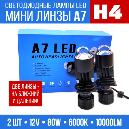 Светодиодные лампы H4 (мини линзы H4 A7) предназначены для установки в фары головного света без их разборки. Их главное преимущество - наличие двух линз и собственных отражателей. Наши LED лампы совмещают в себе обе функции головной оптики автомобиля - ближний и дальний свет. Устанавливаются как обычные галогенные лампы. Обратите внимание! У некоторых моделей авто внутри фары установлен колпачок для отсечки пучка света. Его необходимо демонтировать. Яркий (10000lm) и приятный белый свет (6000K). Мини линзы H4 A7 имеют четкую свето-теневую границу (СТГ), исключающую ослепление встречного потока. Ближний и дальний свет формируются отдельными полусферическими отражателями и линзами лампы, минуя отражатель фары, и формируя равномерный яркий световой пучок без засветов и мерцания. В лампе используется две линзы и два отражателя. Использование в конструкции авиационного алюминия, а также охлаждающий вентилятор и встроенный термо-контроль, не дают лампе перегреваться во время работы.