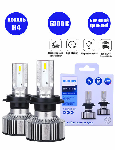Комплект включает в себя 2 автомобильные лампы с цоколем H4. Поддерживается как общий +, так и общий минус. Светодиодные лампы Philips - это высококачественный продукт от известного бренда, который зарекомендовал себя на рынке автомобильных ламп. Особенностью этих ламп является активное охлаждение, встроенный в лампу кулер охлаждения светодиодов. Это обеспечивает долгий срок службы ламп, предотвращая перегрев и выход из строя. Лампы Philips имеют цоколь H4, что делает их совместимыми с большинством автомобилей, так же лампы не содержат дополнительных блоков и переходников, что позволяет установить их в штатное место блок фары. Питание ламп осуществляется от 12 до 24 Вольт, что позволяет использовать их в автомобилях с различным напряжением бортовой сети. В целом, светодиодные лампы Philips - это надежный и качественный выбор для тех, кто ценит комфорт и безопасность на дороге.