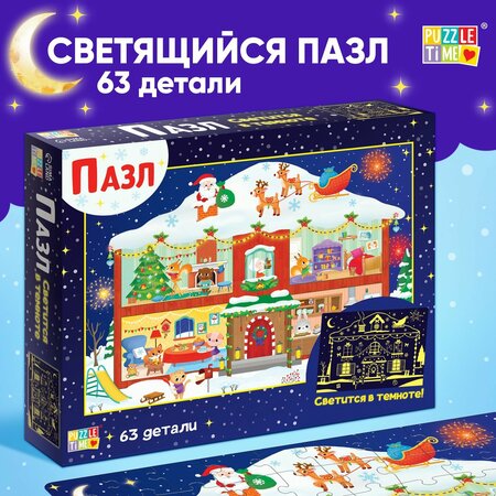 Светящийся в темноте пазл «Новогодние хлопоты» — это не просто пазл, а волшебная игра-головоломка! Достаточно выключить свет в комнате, и вы увидите, как собранная картинка благодаря особой краске начнёт светиться в темноте. Такой подарок поможет ребёнку скрасить ожидание Нового года, а также потренировать мелкую моторику, внимательность, логическое мышление и память. Особенности светящегося пазлаСобрав все 63 детали в одно целое, вы получите красочную картинку размером 33 × 23 см. Пазл состоит из крупных деталей, что очень удобно для маленьких пальчиков. Благодаря особой краске пазл светится в темноте. Чтобы зарядить флуоресцирующие элементы, поместите пазл под источник света не менее чем на полчаса. Затем выключите свет и наслаждайтесь волшебной картинкой. Как сохранить собранный пазлНанесите клей для пазлов на лицевую сторону получившейся картинки, равномерно распределите его по поверхности./li Дополнительно В наборе 63 детали. Размер одной детали: 4 × 4 см. Размер игрового поля: 23 × 33 см. Рекомендовано детям старше 3 лет.