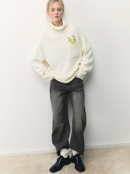 - Вязаный свитер из новой коллекции Befree Co: Create — Андржиевская - Вторая коллекция с художницей Анной Андржиевской посвящена уютным и теплым посиделкам с друзьями и близкими в праздничные вечера. Ее сюрреалистичный мир, наполненный символами и фантастическими персонажами, мы перенесли на яркие вязаные свитера и аксессуары с тактильными элементами - Удлиненный свитер свободного кроя выполнен из мягкой, приятной к телу ткани плотной вязки. Высокий воротник-стойка, длинные рукава со спущенной линией плеча, накладной карман на груди. Воротник, манжеты и нижний край в рубчик. В коллекции представлен молочный джемпер с принтом-вышивкой на груди - Свободный вязаный джемпер с милой вышивкой станет отличным вариантом подарка на новогодние и рождественские праздники. Носи его с удобными широкими джинсами, женственными юбками или создавай гранж-образы с джинсами скинни или кожаными леггинсами. Мягкий свитер с вышивкой подойдет также в качестве уютной домашней одежды на холодное время года - Размер на модели: S