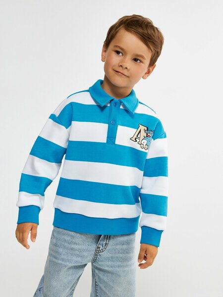 Детский полосатый джемпер для мальчика выполнен из футера с мягким начесом на изнаночной стороне, что обеспечивает тепло и комфорт. Модель отличается свободным прямым силуэтом, приспущенным плечом и слегка увеличенным объемом рукава, добавляя удобство и стильный акцент. Отложной воротник и короткая застежка на две пуговицы упрощают процесс одевания. На груди выделяется принт с буквой "А" и забавным монстриком, придающий джемперу игривый и оригинальный вид. Этот джемпер отлично комбинируется с джинсами или трикотажными джоггерами, создавая удобный и стильный комплект для прогулок или детского сада.
