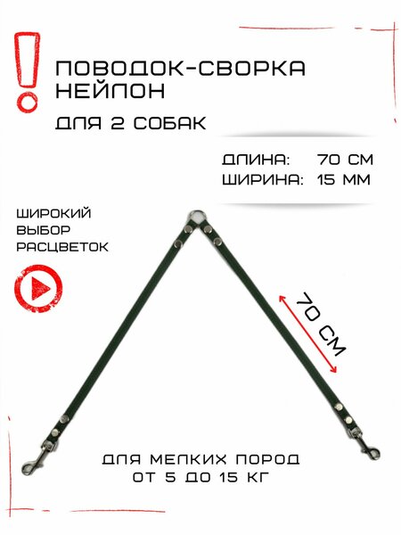 Сворка для собак - современное решение выгула, дрессировки и участия в выставках двух собак одновременно. Поводок при использовании сворки требуется всего лишь один. Сворка изготовлена из нейлона, длина стропы - 40 см, толщина стропы - 15 мм (1,5 см), предназначена для собак мелких пород (от 5 до 15 кг). В наличии сворки 40 см, 55 см и 70 см. Сворка двойная оснащена вращающимися на 360 градусов металлическими карабинами, что предотвращает перекручивание строп. Рулетка, поводок, водилка, перестежка и шлейка отлично крепятся к сворке. У нас в магазине имеются поводки сворки для выгула двух и трёх собак и готовые комплекты для выгула - сворка для 2 или 3 собак + поводок 1.5 м. В карусели карточки Вы можете ознакомиться со всем ассортиментом двойных нейлоновых сворок шириной 15 мм. Просто введите в поиске артикул понравившегося цвета и откроется карточка товара.