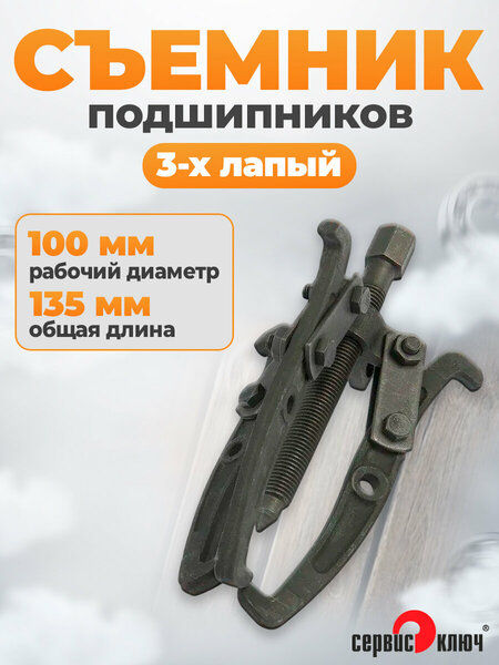 Съёмник подшипников сервис ключ 3-х лапый 100 мм — это универсальный инструмент для снятия подшипников с валов или осей без повреждения деталей. Этот съемник может использоваться как в автосервисах, так и в домашних условиях для ремонта и обслуживания различных механизмов и устройств. Съемник подшипников состоит из трех лапок длиной 125 мм, которые равномерно расположены вокруг центральной оси и имеют специальные зацепы для надежного захвата подшипника. Лапки подгоняются под размер подшипника и фиксируются с помощью гайки на оси. Инструмент изготовлен из высококачественной инструментальной стали и покрыт антикоррозионным слоем. Съемник имеет долгий срок службы и не требует особого ухода. Характеристики: Бренд: сервис ключ Артикул: 79100 Тип: сьемник подшипников Материал: инструментальная сталь Общая длина: 135 мм Длина лапки: 125 мм Длина болта: 130 мм Рабочий диаметр: 100 мм Вес: 670 гр.