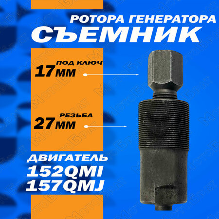 Съёмник магнето (ротора генератора) — это специализированный инструмент, разработанный для снятия магнето с двигателей скутеров с маркировкой 152QMI и 157QMJ, обладающих объёмом 125–150 см3. Данная процедура необходима для ремонта или замены генератора, поскольку магнето играет ключевую роль в выработке электроэнергии, используемой для заряда аккумулятора. Основные характеристики: - Длина съёмника: 50 мм - Длина резьбовой части: 18 мм - Внешний диаметр резьбы: 27 мм - Внутренний диаметр резьбы: 16 мм - Длина болта: 81 мм - Диаметр резьбы болта: 14 мм - Направление резьбы: правая - Ключ: шестигранный на 17 мм - Материал: сталь В комплекте 1 съемник Съёмник применяется путём вкручивания резьбового конца в специальное гнездо магнето, фиксирующего его на оси двигателя. Затем с помощью гаечного ключа выкручивают стопорный болт, освобождая магнето от давления. Это позволяет снять магнето для дальнейшей проверки или замены.