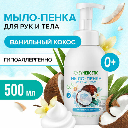 Synergetic Гипоаллергенное натуральное детское мыло-пенка для рук и тела Ванильный кокос 0.5 л