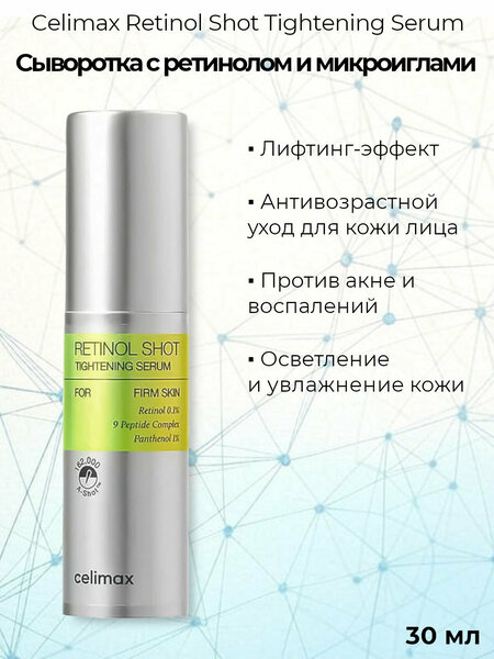 Ищете эффективное средство для борьбы со старением кожи и акне? Celimax The Vita-A Retinol Shot Tightening Serum - Подтягивающая сыворотка с ретинолом и микроиглами — это инновационный продукт корейской косметики, созданный для интенсивного ухода за кожей с первыми признаками старения и проблемами акне. Благодаря уникальной формуле с ретинолом (0,1%), микроиглами и комплексом из 9 пептидов, сыворотка обеспечивает заметный лифтинг-эффект, разглаживает мимические и статические морщины, осветляет пигментацию и предотвращает появление комедонов. Добавленный пантенол успокаивает кожу, усиливая её регенерацию и увлажнение. Эта подтягивающая сыворотка подходит для вечернего ухода и работает на клеточном уровне, стимулируя обновление, активируя выработку коллагена и эластина. Она эффективно регулирует выработку себума, уменьшает размер и глубину пор, выравнивает тон и текстуру кожи, обеспечивая антиоксидантную защиту. Продукт идеален для тех, кто хочет замедлить старение, избавиться от воспалений и вернуть коже сияющий вид. Безопасная формула делает сыворотку подходящей даже для чувствительной кожи, если соблюдать рекомендации по применению. Преимущества подтягивающей сыворотки: Лифтинг-эффект: Сокращает морщины и подтягивает кожу. Антивозрастной уход: Стимулирует коллаген и эластин благодаря ретинолу. Против акне: Снижает риск комедонов и воспалений. Осветление: Убирает пигментацию и выравнивает тон. Увлажнение: Пантенол успокаивает и питает кожу. Как использовать сыворотку? 1. Нанесите сыворотку на этапе вечернего ухода после очищения. 2. Возьмите небольшое количество и распределите тонким слоем по всему лицу. 3. Дайте впитаться и завершите уход нанесением увлажняющего крема. 4. Используйте 2-3 раза в неделю, избегая агрессивного солнца без SPF. Результат заметен уже через 2-4 недели: кожа становится более упругой, гладкой и сияющей. Добавьте Celimax The Vita-A Retinol Shot Tightening Serum в свой ритуал красоты и наслаждайтесь молодостью и здоровьем кожи каждый день. Купите подтягивающую сыворотку с ретинолом прямо сейчас и откройте секрет корейского ухода!