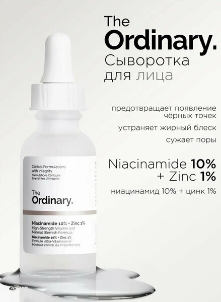 Сыворотка для лица от прыщей The Ordinary Niacinamide 10% + Zinc 1% предназначена для устранения кожных высыпаний и уменьшения выделения кожного жира. Объем составляет 30 мл, что делает ее удобной для использования в домашних условиях. Сыворотка на водной основе содержит ниацинамид 10% и цинк 1%, которые являются активными и безопасными косметическими ингредиентами. Ниацинамид способствует увеличению синтеза коллагена, снижению чувствительности кожи, сокращению морщин и оказывает мощное противовоспалительное действие. Цинк, в свою очередь, обладает выраженым антисептическим и восстанавливающим действиями, а также регулирует работу сальных желез и влияет на структуру кожи. Подходит для любого типа кожи, сыворотка не тестируется на животных, не содержит спирта, формальдегида и красителей. Сыворотка для лица от прыщей и акне The Ordinary Niacinamide 10% + Zinc 1% - это эффективное и безопасное средство для ухода за кожей, которое поможет справиться с проблемами воспалений и улучшить состояние кожи.