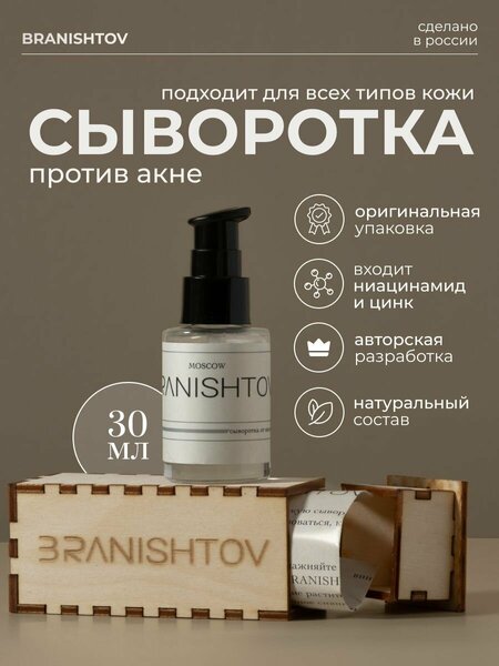 Наслаждайся своей чистой и сияющей кожей лица с нашим эффективным комплексом! Себорегулирующая сыворотка с ниацинамидом BRANISHTOV станет Вашим секретным оружием в борьбе с несовершенствами дермы. Лечебная болтушка от прыщей помогает от акне и черных точек на носу, уменьшает морщины, очищает закупоренные поры, избавляет от покраснения, пигментации и шелушения. Ее успокаивающий эффект уменьшит воспаления и вернет сияние, а отшелушивающее и восстанавливающее действия избавят от постакне. Выравнивающая тон, сыворотка от прыщей может наноситься под макияж. Очищающее средство подходит для любого типа кожи, включая нормальную, комбинированную, жирную и чувствительную. Ниацинамид + цинк – мощная формула, избавляющая от подкожных закрытых комедонов, сальных нитей и пигментных пятен. Цинковый комплекс anti acne стимулирует микроциркуляцию, устраняет мелкие морщины. Витамин Е восстанавливает эпидермис, возвращает ему эластичность и упругость. Кора березы нормализует работу сальных желез, помогает против угрей и рубцов. Экстракт косточки граната сужает и очищает поры, обладает увлажняющими и противовоспалительными свойствами. Эффективен против экземы и псориаза. Семя огурца успокаивает и освежает, убирает отеки и темные круги под глазами, а корень одуванчика используется как отбеливающее и тонизирующее средство для сухой кожи от угревой сыпи. Восстанавливающие уходовые средства анти акне показаны для взрослых и подростков, которые столкнулись с высыпаниями на лице и нуждаются в его лечении. Комплекс может быть направлен на борьбу с дерматитом и себореей. Мультифункциональная boltushka обеспечит питание дермы, поможет против жирного блеска. Она обладает поросуживающим и сужающим поры эффектом, что делает комплекс идеальным для мужского и женского ежедневного ухода. Профессиональный базовый уход без похода к косметологу – это реальность. Мы предлагаем люксовую косметику премиум-качества, гарантирующую видимый оздоравливающий эффект уже после первого курса использования!