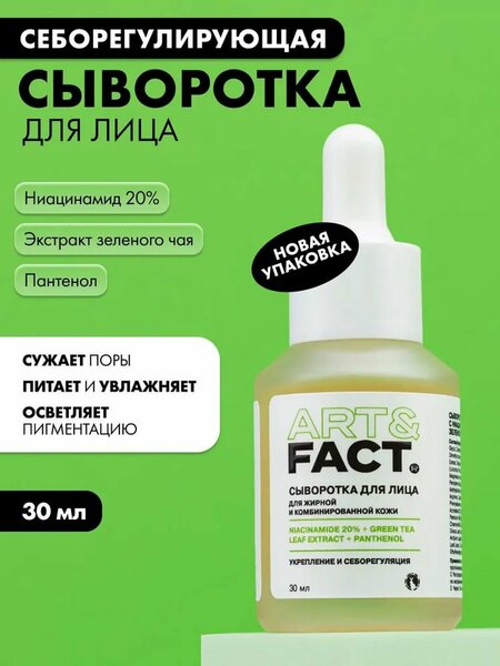 Сыворотка для лица «Себорегулирующая» Art&Fact с ниацинамидом 20 %, экстрактом зеленого чая и пантенолом. Ниацинамид в высоких дозировках способствует снижению секреции кожного сала, сужению пор и укреплению структуры кожи. Снижает дряблость, помогает в борьбе с признаками увядания кожи. Экстракт зеленого чая обладает антиоксидантными свойствами, активизирует работу клеток, выравнивает тон кожи, способствует регуляции выработки кожного сала. В сочетании с пантенолом увлажняет кожу. - Ровный тон и рельеф кожи - Заживление воспалений - Питание и увлажнение кожи - Устранение пигментных пятен Способ применения: Наносить на чистую протонизированную кожу утром и вечером. Распределите до полного впитывания по направлению массажных линий. Через 15 минут закройте сыворотку кремом. Курс 2–3 месяца.
