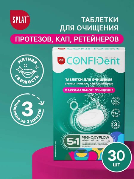 Таблетки для чистки зубных протезов, кап, пластин и ретейнеров CONFIDent разработаны Инновационной Лабораторией SPLAT для полностью и частично съемных ортоконструкций. Максимальное очищение и 5 свойств внутри одного продукта! Основная действующая технология таблеток - PRO-O2XYFLOW advanced system (европейская патентная заявка). Основана на действии активного кислорода и обеспечивает бережное антибактериальное очищение всего за 3 минуты! научно доказано: - Устраняют в 10 раз больше бактерий и грибков, чем обычная зубная паста; - На 99,9% уменьшают число патогенных бактерий; - Глубоко очищают, помогая вернуть зубным протезам их первоначальный цвет; - Бережно ухаживают и придают им свежесть при ежедневном использовании. Один продукт - 5 эффектов: - Очищение и осветление - Мятная свежесть - Бережный уход - Антибактериальное действие - Подходят для кап, пластин и ретейнеров. В составе: - Два источника активного кислорода: моноперсульфат калия и перкарбонат натрия обеспечивают очищающий и антисептический эффект; - Усилитель действия активного кислорода катализатор на основе марганца и протеаза субтилизин - Содиум кокосульфат - дополнительное очищающее действие. Благодаря сплат конфидент Экспресс 5 в 1, вы можете быть уверены в сохранении длительной чистоты и гигиены своих орто конструкций!