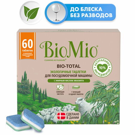 Экологичные таблетки для посудомоечной машины 7-в-1 BIO-TOTAL с эфирным маслом эвкалипта эффективно и деликатно, с заботой о посуде удаляют самые стойкие загрязнения даже при низких температурах, придавая дополнительный блеск и сияние стеклу, нержавующей стали, нейтрализуя запахи. Таблетки быстро растворяются в воде, смягчая ее, тем самум предупреждая образование изветскового налета, способстсвуя более надежной и долговечной работе машины; BioMio - линейка эффективных средств для дома, использование которых приносит удовольствие. Продукты, созданные с любовью и заботой, идеально справятся с загрязнениями, оставаясь при этом абсолютно безопасными, экологичными и особенно незаменимыми, если в доме есть малыш. Рекомендации по применению: промойте сильно загрязненную посуду. Положите 1 таблетку в предусмотренное отделение вашей посудомоечной машины. Выберите соответствующую программу для мытья посуды и запустите машину. Подходит для разных температурных режимов (50-70°С). В регионах с жесткой водой добавьте соль и ополаскиватель в машину. Объем: 60 шт. - Эффективно и деликатно, с заботой о посуде удаляют самые стойкие загрязнения даже при низких температурах - Деликатно воздействуют на стекло - Смягчают воду, предупреждая образование известкового налета, способствуя более надежной и долговечной работе машины - Нейтрализуют запахи - Быстрорастворимые – подходят для коротких программ** - Безопасно для планеты Рекомендации по применению: промойте сильно загрязненную посуду. Положите 1 таблетку в предусмотренное отделение вашей посудомоечной машины. Используйте специальную соль и ополаскиватель при каждом помывочном цикле. Выберите соответствующую программу для мытья посуды и запустите машину. Подходит для разных температурных режимов (50–70 °С). Обратите внимание! Каждая таблетка находится в водорастворимой упаковке, нет необходимости удалять обертку. Не рекомендуется мыть в посудомоечной машине антикварный и расписной фарфор, хрусталь, изделия из декоративного стекла, предметы с ручками из кости, деревянную посуду и пластиковые изделия, которые не выдерживают температуру выше 70 °С, алюминиевые изделия и предметы с отделкой золотом или другими драгоценными металлами.