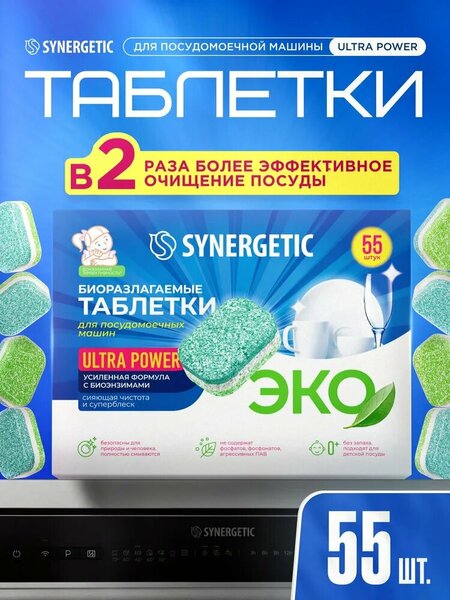 Таблетки для посудомоечных машин SYNERGETIC ULTRA POWER: эффективное и безопасное решение Таблетки для посудомоечных машин SYNERGETIC ULTRA POWER представляют собой эффективное и безопасное средство для сияющей чистоты посуды и столовых приборов. В упаковке содержится 55 водорастворимых таблеток, которые обеспечивают безупречный результат даже в жесткой воде и на коротких программах мойки. Усиленная формула с био-энзимами Новая усиленная формула с био-энзимами эффективно удаляет жир и сложные загрязнения, обеспечивая безупречный результат. Протеаза удаляет белковые загрязнения, амилаза – крахмальные. Активные соединения кислорода и ПАВ на растительной основе интенсивно расщепляют загрязнения. Специальные добавки предотвращают повторное оседание загрязнений, помутнение стекла и придают посуде кристальный блеск без разводов. Также они защищают машину от накипи и полностью смываются водой. Безопасность для природы и человека Таблетки SYNERGETIC ULTRA POWER не содержат фосфатов, фосфонатов, агрессивных ПАВ и искусственных ароматизаторов. Они безопасны для природы и человека, рекомендованы производителем бытовой техники из Европы Hansa. Биоразлагаемые компоненты не вредят микрофлоре септических установок, что делает их безопасными для окружающей среды. Для достижения максимального результата рекомендуется применение специальной соли и ополаскивателя SYNERGETIC. Упаковка и применение Таблетки упакованы в водорастворимую пленку и поставляются в коробке. Способ применения – посудомоечная машина. Подробная комплектация включает коробку и таблетки.