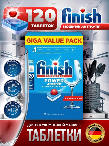 Таблетки для посудомоечной машины Finish Power Essential, 120 штук это удобные многофункциональные безфосфатные капсулы для ПММ, которые работают в 6 областях. Они не только имеют функцию предварительного замачивания и эффективно очищают все виды посуды, включая стеклянную посуду и приборы из серебра, но также удаляют стойкие пятна, такие как остатки чая, кофе и жирные пятна. Концентрированное моющее средство для чистки и мытья посуды all in one также действует как соль и ополаскиватель, работает даже при низких температурах. Новая формула Power ball производит сверкающие пузырьки, которые глубоко распределяют очищающие ферменты, удаляя жир и остатки пищи. Без резкого запаха. Оставляют свежий аромат лимона. Эффективная формула посудомоечного средства все в одном справляется с сильными загрязнениями, пригоревшей пищей и обеспечивает отличный результат при каждом использовании. Таблетки для посудомойки Финиш пауэр бол обеспечивают максимально возможную чистоту и блеск с первого раза, не оставляют разводов. Предотвращает оседание известкового налета и каменных отложений. Не содержит фосфатов. 1 капсула - 1 загрузка. Для сохранения свойств всегда закрывайте упаковку после использования. Хранить при комнатной температуре, в сухом, не доступном для детей месте. Рекомендовано ведущими производителями посудомоечных машин.