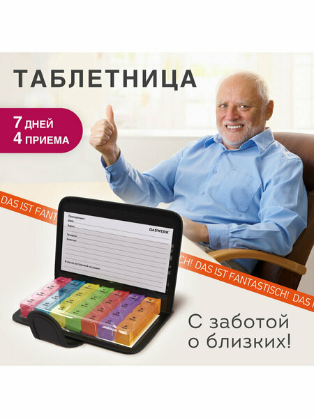 Таблетница DASWERK — идеальный органайзер для таблеток и витаминов, который поможет вам упорядочить прием лекарств на неделю. Компактный контейнер для таблеток состоит из 7 съемных мини-контейнеров, каждый из которых разделен на 4 отделения для удобного распорядка: утро, день, вечер и ночь. Чехол на кнопке из черной искусственной кожи не только стильно выглядит, но и надежно защищает содержимое. Контейнер для таблеток имеет маркировку на русском языке, выполненную с использованием УФ печати, что обеспечивает долговечность надписей даже при частом использовании. Благодаря яркой цветовой кодировке, вы легко сможете организовать лекарства на день. Таблетница-органайзер делает прием витаминов и лекарств удобным и безопасным, поэтому не упустите возможность сделать свою жизнь проще и более организованной с этим многофункциональным органайзером для таблеток! • Количество дней: 7. • Количество ячеек: 28. • Окно для маркировки: да. • Серия: DAS HAUS. • Длина: 195 мм. • Ширина: 120 мм. • Высота: 30 мм. • Материал: пластик, искусственная кожа. • Артикул производителя: 630842.