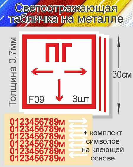 Табличка выполнена из толстого оцинкованного металла толщиной 0,7мм. Лицевая часть светоотражающая пленка, метод аппликация, надежный и проверенный способ печати, как у дорожных знаков. Пленка используется серии ТМ-3100. В комплекте есть белые стрелки чтобы заклеить одну или две стрелки красные (ненужное направление), также есть цифры от 0 до 9 чтобы можно указать количество метров до гидранта. Табличка предназначена для внутреннего и уличного использования, изображение в соответствии с ГОСТ 12.4.026-2015.
