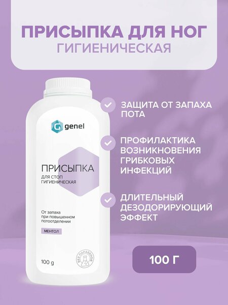 Присыпка для ног от запаха и пота G® Genel обеспечивает длительный дезодорирующий эффект и служит профилактикой возникновения грибковых инфекций. Присыпка в виде мельчайшего порошка обеспечивает легкое распространение по обуви и коже ступней для достижения максимального эффекта защиты от запаха пота. Предохраняет кожу от воздействия влаги, натертостей, появления опрелостей и раздражений. Присыпка оказывает подсушивающее профилактическое действие. Формат пудры издавна используется в качестве присыпки для детей младенческого возраста и обладает несомненными преимуществами перед другими форматами (крем, гель). Удобный флакон позволяет без контакта с кожей наносить присыпку в труднодоступные места, обеспечивая максимально эффективное и продолжительное действие. Присыпка может использоваться в разных случаях - например, при депиляции, на маникюре и педикюре, для лежачих больных, для использования с резиновыми перчатками - как защиту кожи рук, при натирании обуви, потливости ног, рук, лица. Также присыпку можно использовать вместо дезодоранта или сухого шампуня при необходимости. Рекомендуется подросткам в качестве безвредного дезодоранта для ног и тела.