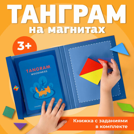 Магнитный танграм, от которого в восторге будет каждый ребенок! Он будет с удовольствием соединять разноцветные детали в разнообразные геометрические фигуры и радоваться своим маленьким победам. Развивашка для малышей улучшает память, развивает мелкую моторику, воображение, внимательность и логику. Играя в эту игру, ребенок учится терпению, усидчивости и самостоятельности. Подумайте только — сколько важных навыков вашему ребенку даст всего одна деревянная головоломка. Для того чтобы получить интересные фигуры на магнитной доске, необходимо правильно расположить все 7 деталей. В комплекте с игрушкой есть вкладыш с заданиями, в котором есть черные и цветные картинки. Черные — это вопрос, цветные — ответ. Сначала нужно посмотреть на черную геометрическую фигуру, а затем постараться изобразить ее на доске. Далее перевернуть страницу и проверить, как вы справились с заданием. Возраст, с которого ребенку комфортно будет знакомиться с нашей развивашкой — 3 года. Однако, можно начинать собирать ее и раньше, ориентируясь только на цветные картинки. Детский танграм выполнен из натурального дерева. У всех деталей сглажены углы, а сами фигурки покрыты безопасной краской и отшлифованы от заусенец. Tangram на магнитах — это прекрасный подарок ребенку, который действительно увлечет его надолго! Головоломку можно брать с собой на улицу, по магазинам, в дорогу вместо гаджета — все детали крепко держатся на доске и не падают, даже если ее перевернуть. Игрушка очень компактная, закрывается на магнит и занимает минимум места в сумке. Подарите своему ребенку нашу увлекательную развивашку с заданиями. Поверьте, он будет в восторге!