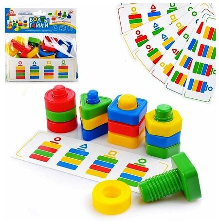 Представляем Вашему вниманию игровой набор включающий пластиковые детальки болтов и гаек большого размера и красочные картинки с заданиями для сборки по предоставленной схеме. Данная игра направлена на распознавание и соотношение цветов и форм разного размера. Элементы легко соединяются между собой только в правильном сочетании: болт с треугольной шляпкой с треугольной гайкой, квадрат с квадратом и т. д. Набор поможет вашему малышу развить зрительно-моторную координацию, образное мышление, усидчивость, воображение, познакомить с различными геометрическими фигурами. Комплектность: 8 болтов, 12 гаек 4 разных цветов и форм (квадрат, треугольник, круг, шестиугольник) 12 карточек с заданиями Красочная упаковка с инструкцией