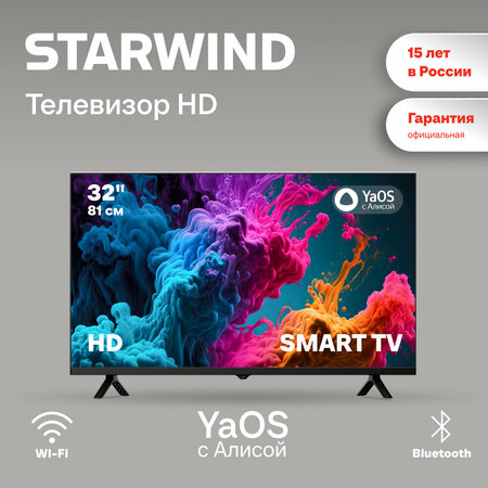 Умный телевизор Starwind 32" SW-LED32SG305 обеспечивает качественную картинку и удобный доступ к стриминговым площадкам. Благодаря современной операционной системе от «Яндекс. ТВ» девайс может управляться голосом. В этом ему помогает виртуальный ассистент – Алиса. Она не только быстро находит необходимый мультимедийный контент, но и умеет выполнять ряд полезных команд. Достаточно нажать на пульте ДУ, идущем в комплекте, соответствующую кнопку и произнести то, что должна сделать Алиса. Экран прибора выводит изображение в формате HD с разрешением до 1366х768 пикселей и частотой обновления 60 Гц. Его диагональ – 32 дюйма, а сам дисплей выполнен в безрамочном дизайне с углами обзора, достигающими 178 градусов. Чтобы обеспечить стабильное соединение с Интернетом, в устройство установлены модуль для беспроводного подключения Wi-Fi, а также классический порт Ethernet для соответствующего кабеля. Данную модель можно синхронизировать со смартфоном, для этого в неё интегрирован Bluetooth современного образца. Кроме того, Starwind 32" SW-LED32SG305 может заменить внешний монитор с динамиками – достаточно использовать для этого его HDMI-порты. Качественный звук в телевизоре обеспечивает пара динамиков мощностью по 8 Вт каждый. Телевизионный сигнал Starwind 32" SW-LED32SG305 принимает посредством тюнеров: DVB-T, DVB-T2, DVB-C, DVB-S и DVB-S2. Слоты USB в устройстве используются для чтения информации в поддерживаемых форматах с флеш-накопителей.