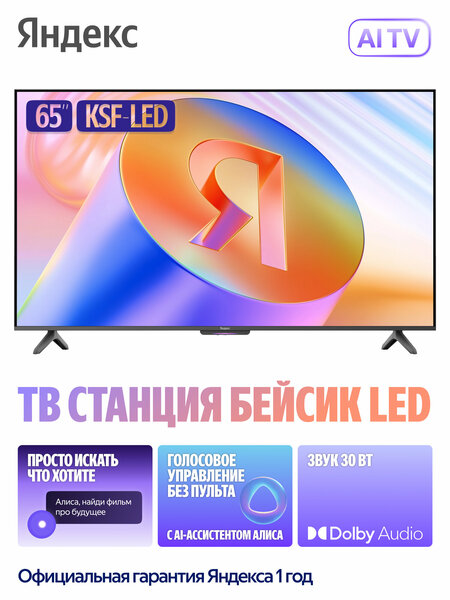 ТВ Станция Бейсик YNDX-00074 — новый умный телевизор Яндекса с диагональю 43" (108 см), сочетающий лучшие технологии телевизоров и умных колонок с Алисой. Технология распознавания голоса Farfield позволяет управлять ТВ Станцией без пульта, с помощью голосовых команд. Алиса найдет нужный контент в приложениях, видеосервисах или нейробраузере. Голосовой ассистент различает членов семьи по голосу и может переключаться между профилями. Алиса работает на нейросети YandexGPT. Это позволяет давать более качественные ответы и придумывать новые идеи. Кроме этого, доступны сотни навыков, которые делают рутинные дела простыми и приятными: поставить напоминание, будильник с любимой песней, заказать такси. Когда ТВ Станция выключена, она работает как Станция с Алисой. Вы можете уточнить у ассистента погоду, попросить включить любимого исполнителя или зажечь свет в комнате. ТВ Станция Бейсик работает на мультимедийной платформе YaOS X. Большой выбор фильмов, сериалов, музыки и блогов — в ТВ Станции Бейсик найдётся всё! Yandex Picture Quality. Блокбастер, матч или лайв любимой группы — что бы вы ни включили, изображение в 4К на большом экране ТВ Станции будет исключительным, ведь инженеры Яндекса настроили его так, чтобы цветопередача была не только выразительной, но и максимально точной, без единой потерянной детали. Yandex Audio Quality. В ТВ Станции звук из высококачественных широкополосных динамиков специально настроен и сбалансирован инженерами Яндекса с учётом всей широты контента, доступного на ТВ Станции. Широкий частотный диапазон и глубокий, чёткий бас обеспечивают великолепные впечатления не только в фильмах, но и при прослушивании музыки. Станцию можно повесить на стену или установить на тумбе. В комплекте имеются черные пластиковые ножки и винты к ним, пульт управления с батарейками AAA, кабель питания и инструкция. ТВ Станция доступна в четырёх диагоналях — на 43, 50, 55, 65 дюймов. ТВ Станция Бейсик — это многофункциональное устройство и центр домашнего развлечения.
