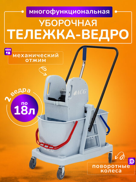 Уборочная тележка с отжимом. Ведра - 2х18л. Тележка уборочная на колесах для уборки помещений - это многофункциональный уборочный инвентарь, предназначенный для эффективной уборки различных помещений. Тележка уборочная с двумя ведрами предназначена для уборки и мойки полов, перемещения воды, моющих растворов и клининговых принадлежностей. Тележка для уборки оснащена удобными съемными ведрами вместимостью по 18 литров, которое имеет металлическую ручку и носик для удобного слива воды. Поворотные колесики из стали с пластиковыми протекторами и защитными бамперами обеспечивают плавное и бесшумное передвижение тележки по поверхности. Ручка для управления тележкой жёстко не закреплена и может перекидываться и фиксироваться с обеих сторон уборочной тележки. На горизонтальную перекладину ручки можно поместить подвесную корзину для моющих составов, протирочных материалов и других принадлежностей. Два ведра уборочных позволяют не смешивать грязную и чистую воду, сливать грязную жидкость в одно ведро, и использовать чистый моющий состав для дальнейшей уборки. Тележка уборочная на колесах для уборки помещений - незаменимый помощник в поддержании чистоты и порядка в офисах, магазинах, ресторанах и других коммерческих или общественных помещениях. У нас есть акции и распродажи, вы можете купить наши товары в подарок под елку, подарок на новый год 2024 и как подарок маме, бабушке, сестре